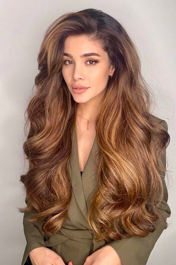 If you’re seeking a way to inject brightness into your hair without fully committing to an all-over color change, this look is your ultimate secret weapon. Natural brunette hair finds its perfect match with delicate, face-framing caramel highlights that are expertly blended to seamlessly merge with your curtain bangs. It’s about enhancing your existing beauty with just a touch of luminosity, creating a soft glow around your features.